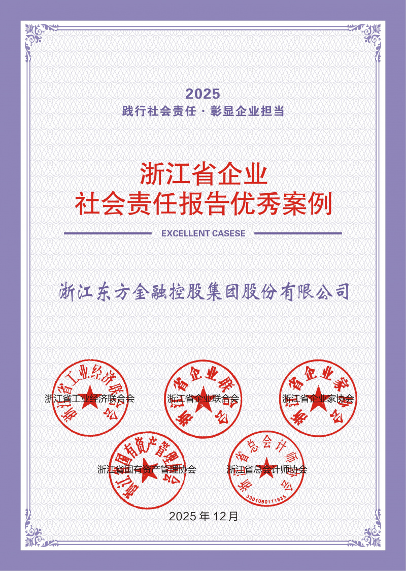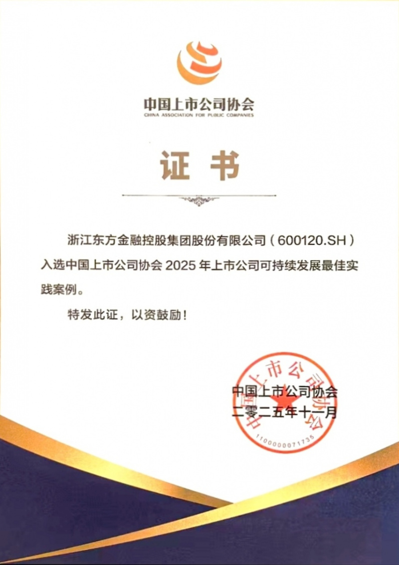 浙江東方再次榮獲“2025年上市公司可持續(xù)發(fā)展最佳實(shí)踐案例”“優(yōu)秀上市公司獎(jiǎng)”“最具社會(huì)責(zé)任上市公司獎(jiǎng)”“2025浙江省企業(yè)社會(huì)責(zé)任報(bào)告優(yōu)秀案例”等多項(xiàng)獎(jiǎng)項(xiàng)。